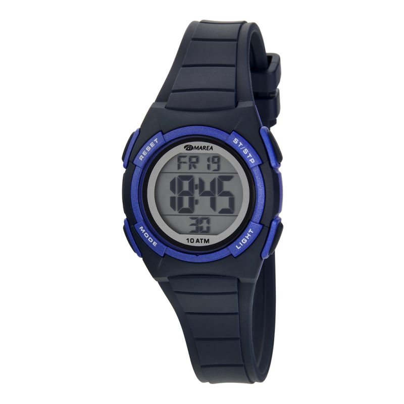 RELOJ SPORT BLANCO, CAJA DE PLÁSTICO CUADRADA AZUL, CORREA DE SILICONA BLANCO, ESFERA DIGITAL, SUMERGIBLE 50M.