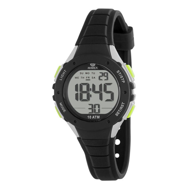 RELOJ DIGITAL, CAJA CUADRADA NEGRA, CORREA MALLA PLATEADA, HORA, LUZ, CRONÓMETRO, ALARMA, SUMERGIBLE 50 M.