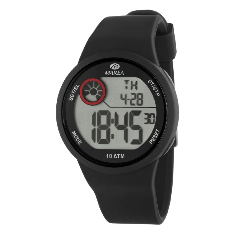 RELOJ SPORT, CAJA DE PÁSTICO COLOR NEGRO CON DETALLES EN ROJO, CORREA DE SILICONA ROJA, ESPERA DIGITAL, SUMERGIBLE 100M.