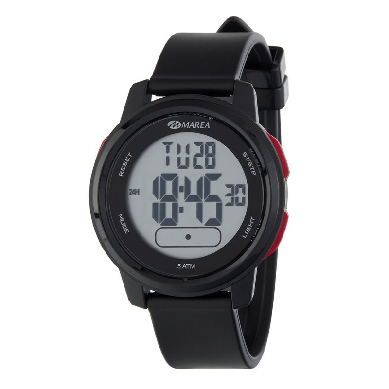 RELOJ SPORT, CAJA DE PÁSTICO COLOR NEGRO CON DETALLES EN ROJO, CORREA DE SILICONA ROJA, ESPERA DIGITAL, SUMERGIBLE 100M.