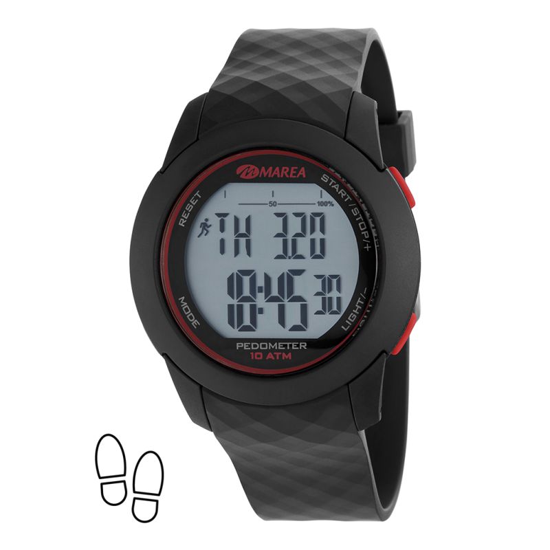 CAJA DE PLÁSTICO COLOR NEGRO CON BISEL PLATEADO Y DETALLE COLOR ROJO, CORREA DE SILICONA NEGRA, ESFERA DIGITAL, SUMERGIBLE 100M.