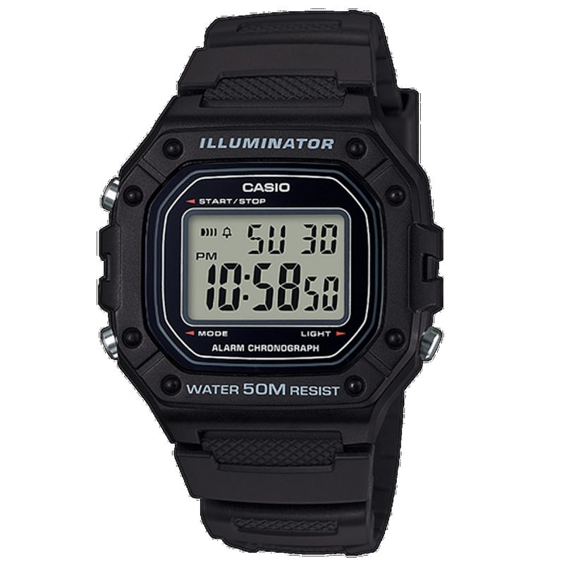RELOJ SPORT NEGRO, CAJA DE PLÁSTICO NEGRO, CORREA DE SILICONA NEGRA, ESFERA NEGRA, MULTIFUNCIÓN, CALENDARIO, CRONÓMETRO, LUZ, ALARMA, SUMERGIBLE 50M.